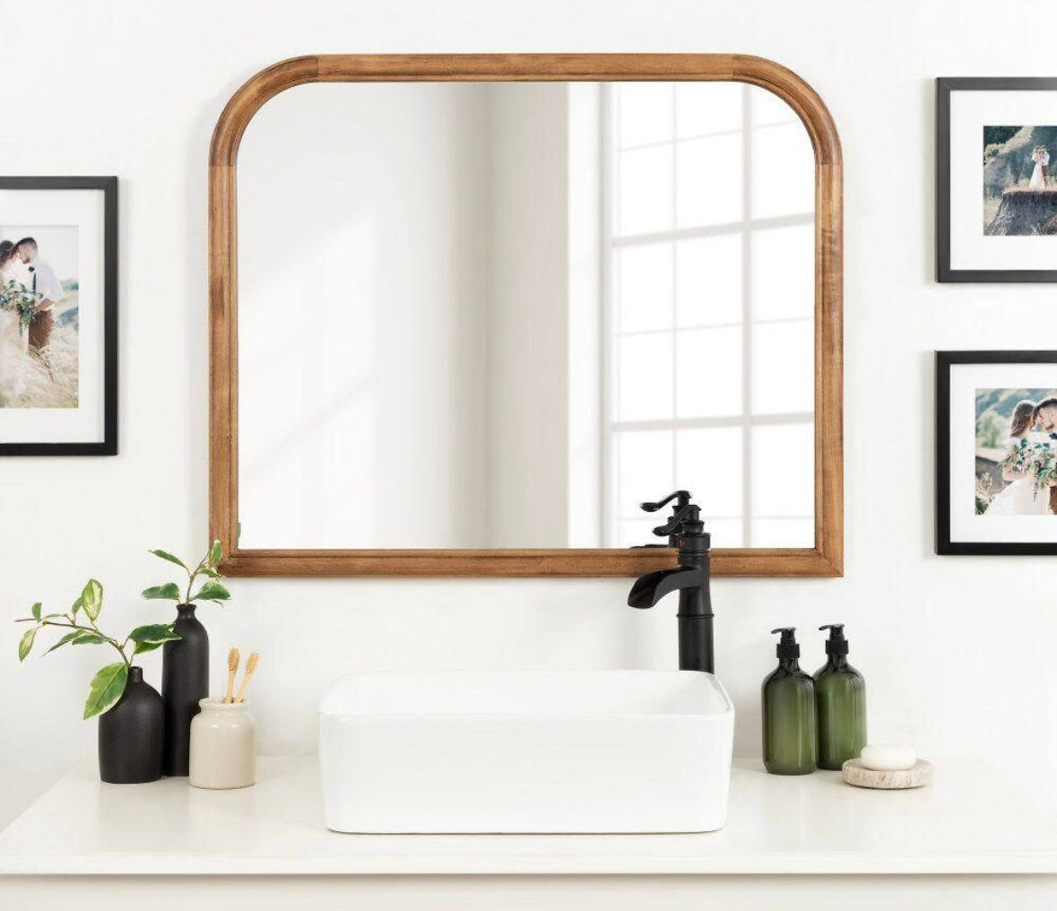 Glenby 34.00 in. W x 28.00 in. H Rustic Brown Arch Transitional Framed Decorative Wall Mirror